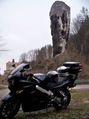 Tym razem nasza droga prowadzi przez teren jury krakowsko-częstochowskiej. Jak się już ma taką atrakcję w okolicy to czasem trzeba z niej skorzystać:) Pierwszy postój robimy w Pieskowej Skałe, przy słynnej Maczudze Herkulesa. W marcowej, jeszcze trochę zimowej scenerii Ojcowski Park Narodowy wygląda jakoś szaro i smutnie, jednak mimo wszystko zawsze spotkamy tutaj turystów oraz motocykle na winklach:) Parkujemy motocykl na zamkniętym jeszcze parkingu tuż przy płynącym tu Prądniku i ruszamy do położonego opodal zamku.