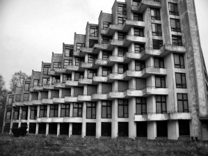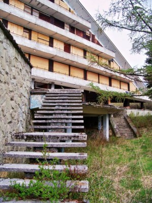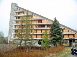 Teraz czeka nas dłuższy fragment, bo jedziemy aż do samego celu, do Ustronia. Ustroń, Wisła, oraz Szczyrk to takie miasta, w których zawsze odnajdujemy coś nowego. Tym razem skupimy się na Ustroniu i przeniesiemy się w czasy PRL-u. W latach 60-tych z inicjatywy Jerzego Ziękta zaczęły powstawać hotele w kształcie piramid, w ramach kompleksu sanatoryjno-uzdrowiskowego. Łącznie powstało 15 takich obiektów, które dziś są symbolem i wizytówką miasta. Potężne żelbetonowe konstrukcje posiadają przeważnie ok. 8 pięter i choć czasy PRL-u już dawno minęły one mają się dobrze. Nas szczególnie interesuje jeden z nich. Mciejka. Piramida-widmo, opuszczona od 2008 roku. Mimo, iż obok znajdują się dwie inne piramidy, które prężnie fukncjonują o Maciejce mało kto słyszał. Trafić jest ciężko. Pytamy tu i tam, aż w końcu trafiamy. Lubimy takie klimaty:) Parkujemy motocykl na tle piramidy i zaczynamy zwiedzanie. Jest możliwość wejścia do środka, więc korzystamy. Niestety wszystkie okna są zabite deskami a czołówki zostały w domu, zatem wyższe kondygnacje musimy odpuścić. Parę minut po opuszczeniu budynku wychodzi z niego również jakiś zakapturzony gość, wysypuje coś z woreczka i znika w krzakach. Dałbym sobie ręce uciąć, że byliśmy tam sami:) Schodami schodzimy do ogrodu, który dziś zarasta wysoka trawa. Można jeszcze spotkać pozostałości po ławkach. Kilka zdjęć, chwila rozmyślań jak to było kiedyś i trzeba jechać dalej.