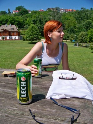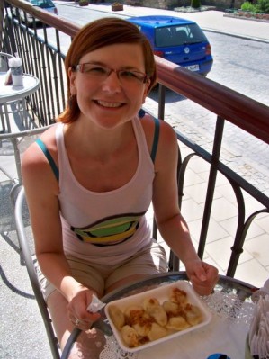 Już u siebie, postanawiamy trochę poleniuchować. Zaglądam do lodówki po małe co nieco a potem zalegamy na ławce. Polewamy się wodą aby ochłodzić ciała a jednocześnie mocniej się opalić. Tyle wrażeń już za nami a na zegarku raptem 13:). Powoli czas na jakiś obiad. Wybór padł na polecane nam już wczesniej pierogi o różnych nadzieniach. Zatem zbieramy się i w drogę raz jeszcze po kamiennych schodach pod górę. Słońce niemal parzy, dlatego uciekamy do cienia i chwilkę odpoczywamy pod ratuszem. Teraz czas na pierogi. Nasza pierogarnia zlokalizowana jest tuż obok Małego Rynku. Można wybierać spośród 30 rodzajów pierogów i każdy może być inny. Porcja 11 szt. kosztuje 12 zł. Pycha:) Naprawdę. Posileni wracamy na rynek a tam kolejna perełka – SHL M04, rocznik ’52.